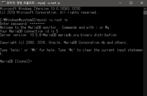 4. cmd상에서 mysql -u root -p 명령어를 입력한 후, root 계정에 대한 비밀번호를 입력한다.