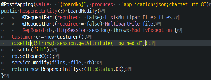 아래와 같은 컨트롤러에 Postman을 사용하여 수정 요청을 보내보자.
