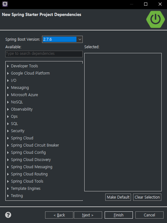 Spring Boot Version은 2번대중에서 SNAPSHOT이 아닌 버전을 선택한다.