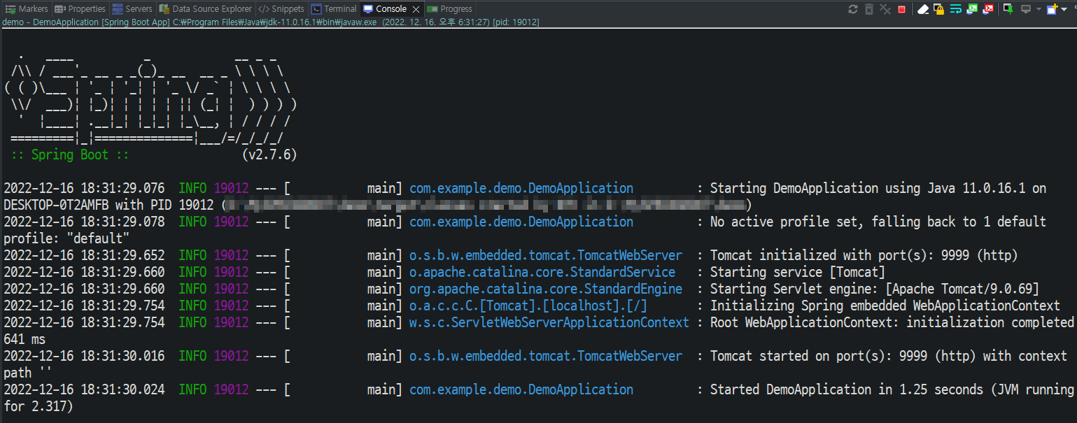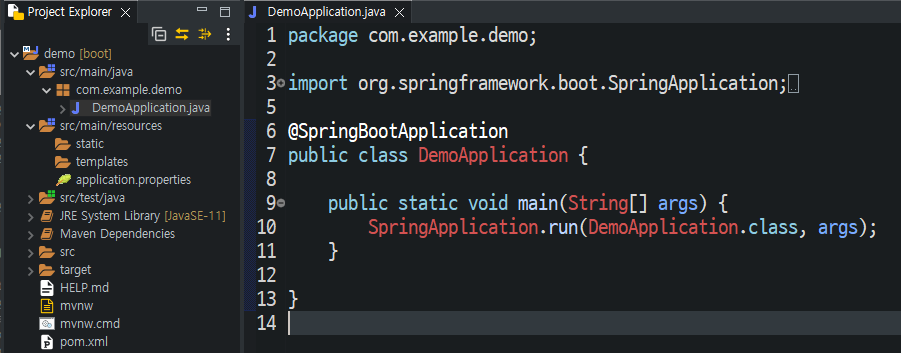 기본 생성된 DemoApplication.java를 보면 main method가 Container를 구동시키고 있는 것을 확인할 수 있다.