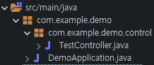 이제 테스트용 Controller를 하나 만들어보자. demo package 밑에 control이라는 package를 추가하고, TestController.java를 만든다.