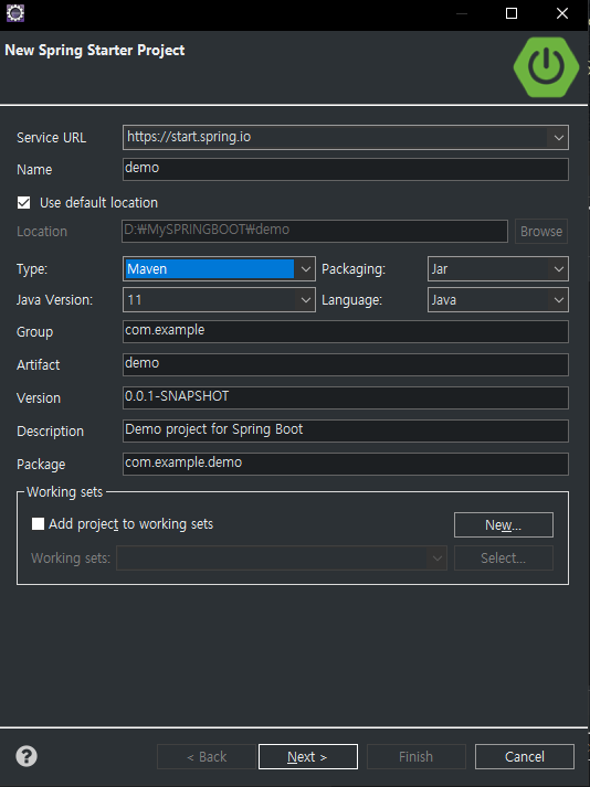 Packaging은 Jar, Java Version은 11을 사용한다.