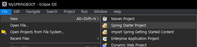 이제 프로젝트를 만들어보자. File -> New -> Spring Starter Project를 선택한다.
