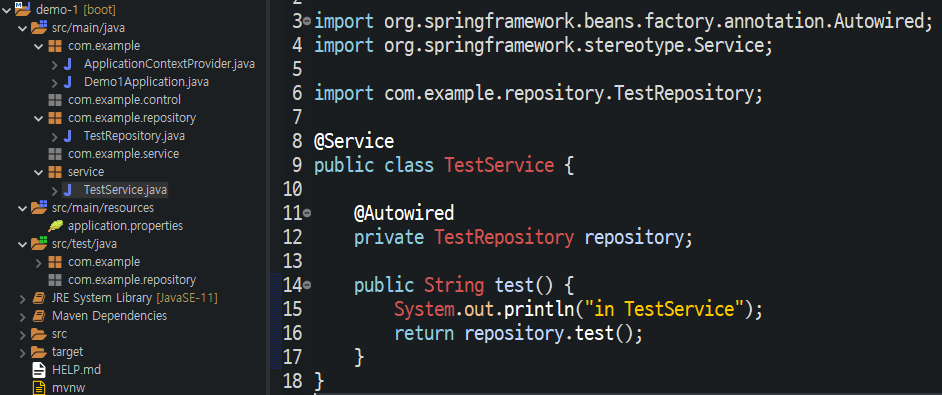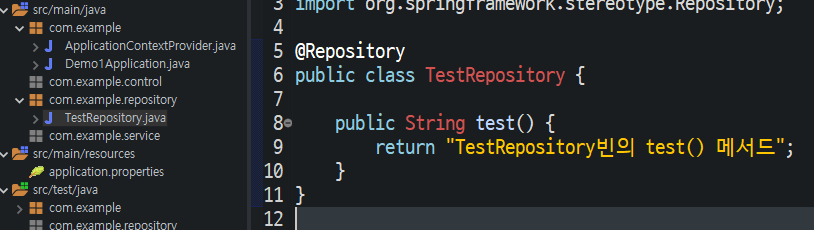 Boot Application Class의 내용도 바꾼다. 컨테이너에 TestRepository Bean이 있는지 찾아볼 것이다.
