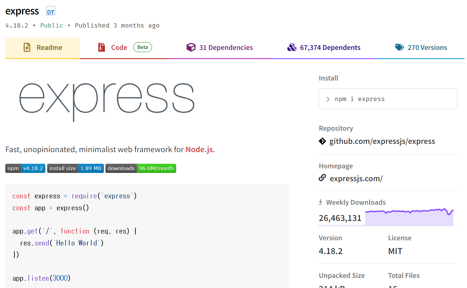 Fast, unopinionated, minimalist web framework. Latest version: 4.18.2, last published: 3 months ago. Start using express in your project by running `npm i express`. There are 67372 other projects in the npm registry using express.
