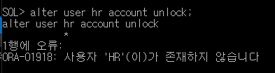 ALTER USER HR ACCOUNT UNLOCK IDENTIFIED ~ 를 해봤으나 HR 계정이 존재하지 않기 때문에 실행할 수 없다고 한다.